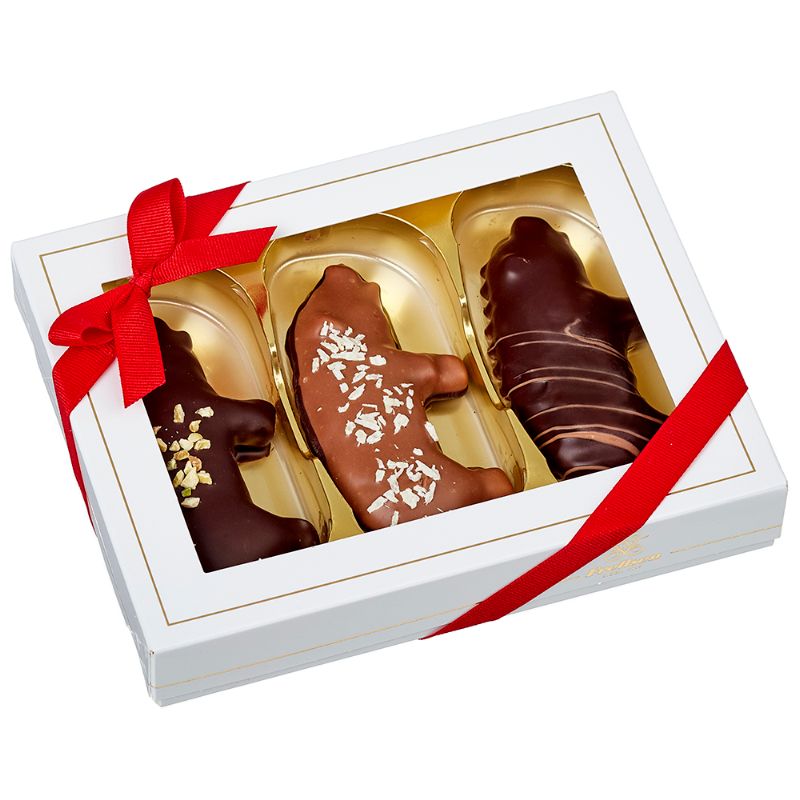 Indeholder én nougat-/marcipangris, én marcipangris med karamel og én marcipangris med lakridstrøffel.
