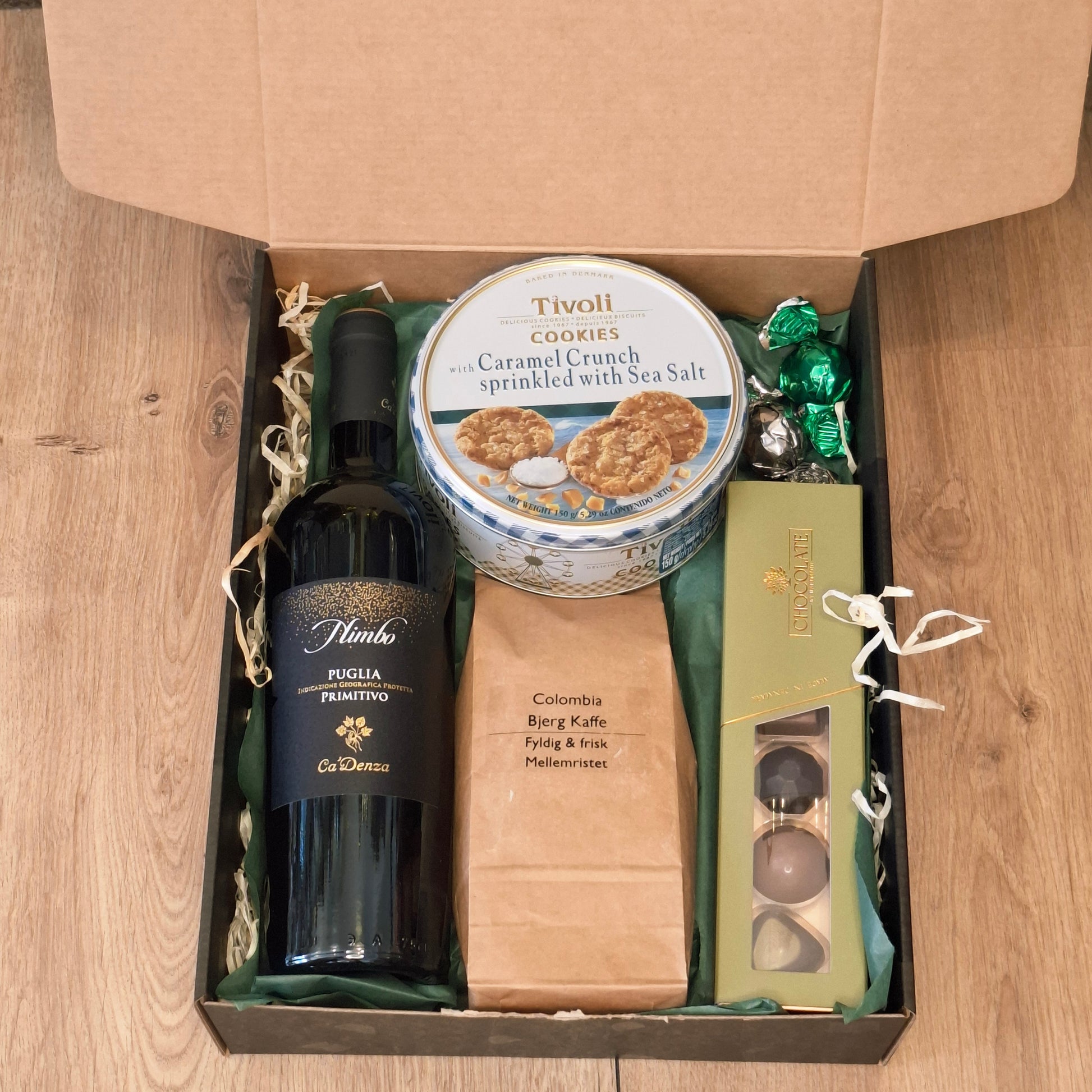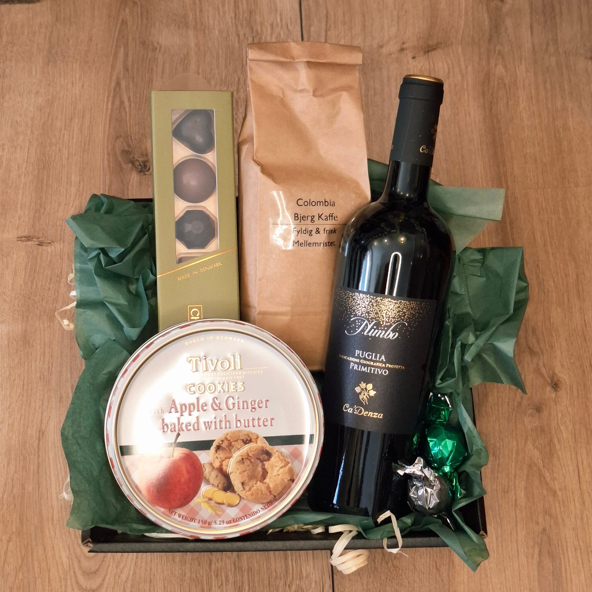 Det er en smagfuld gave fyldt med både søde fristelser, til den skønne kaffe, samt en delikat vin til en hyggelig stund. En harmonisk blanding, der vil glæde alle.