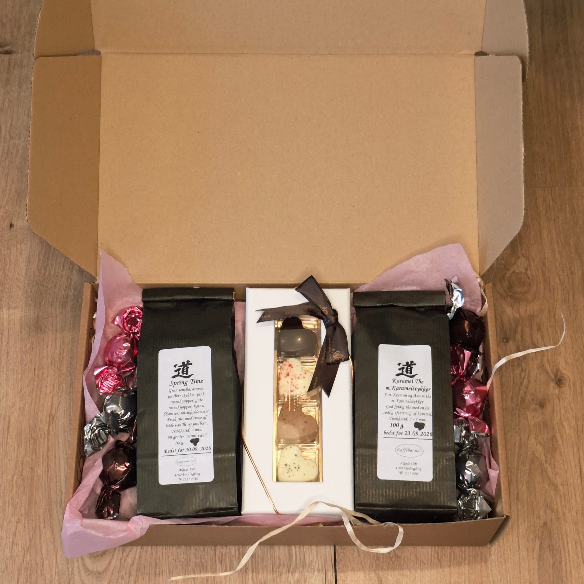 Den perfekte gave til te elskeren som fortjener en lille opmærksomhed. Den smagfulde gave indeholder to forskellige teer og skønne fyldte chokolader.