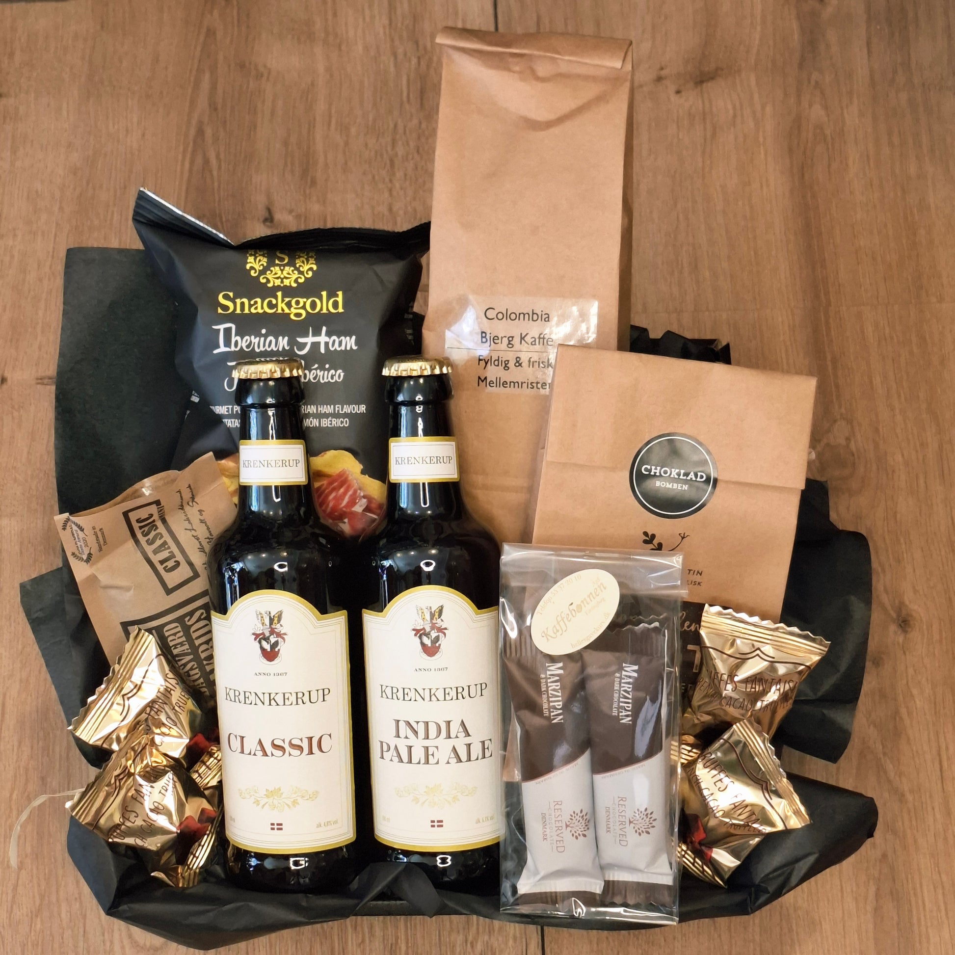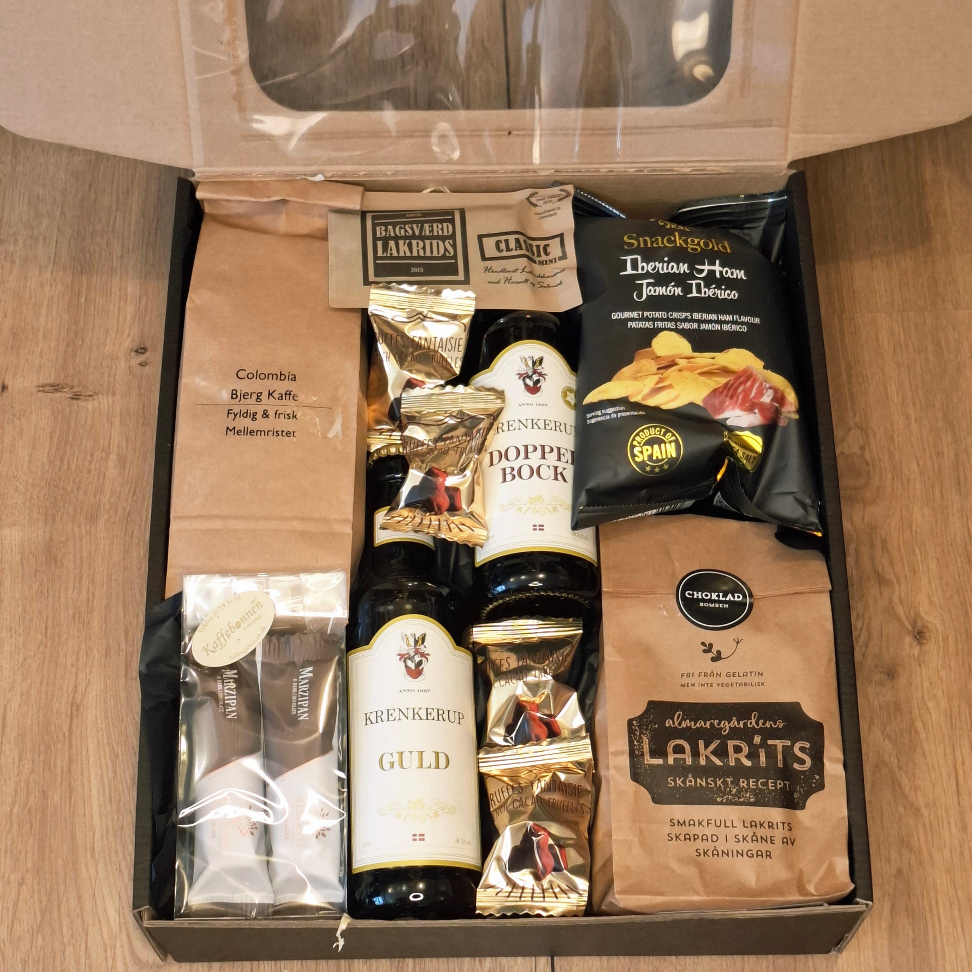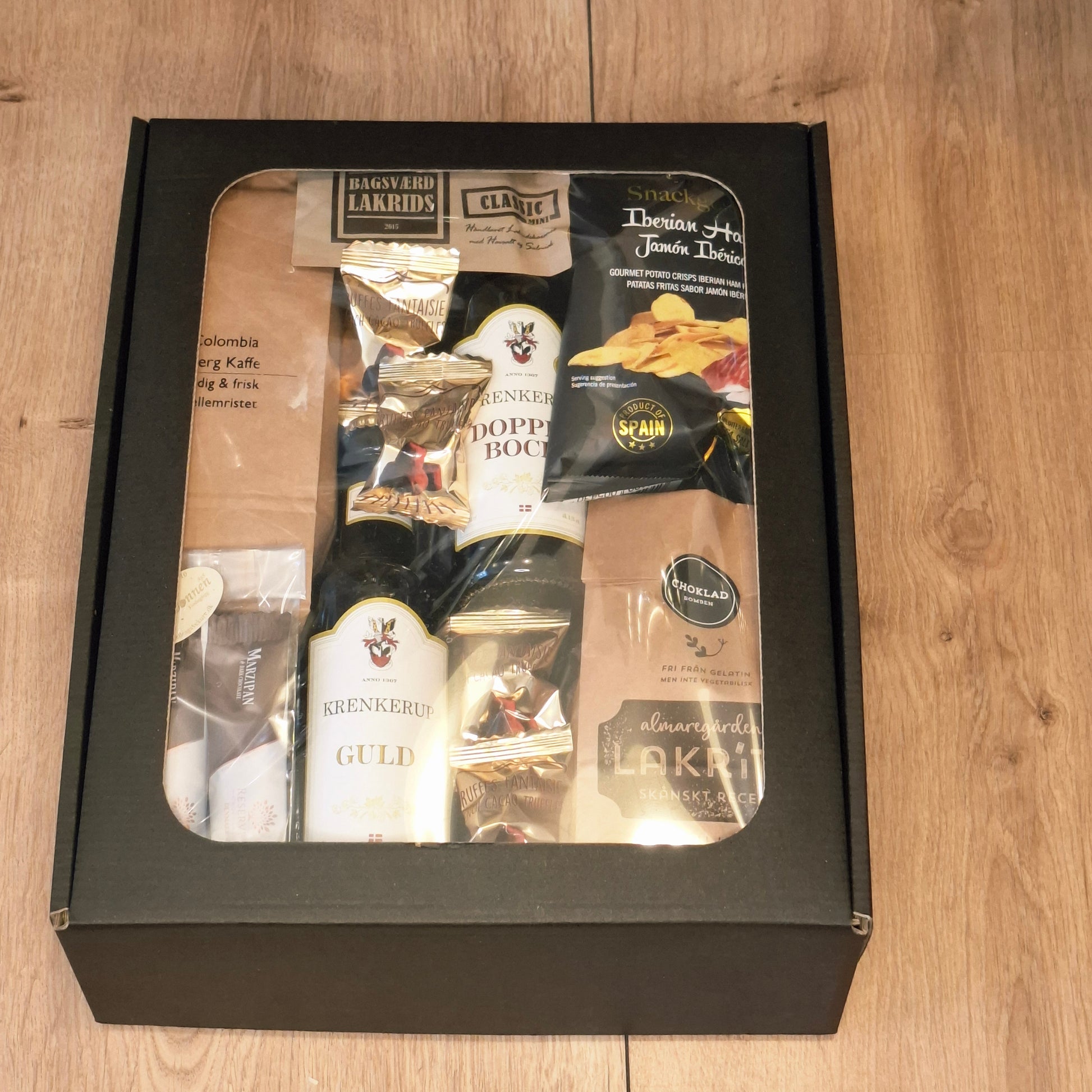 Det er en smagfuld gave fyldt med både søde fristelser, til den skønne kaffe, samt en delikat vin til en hyggelig stund. En harmonisk blanding, der vil glæde alle.