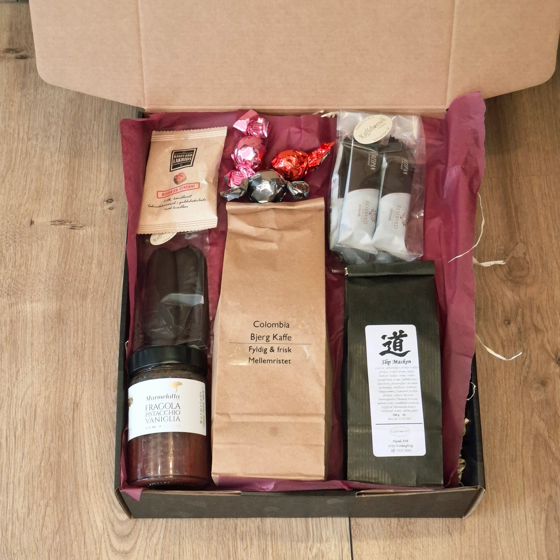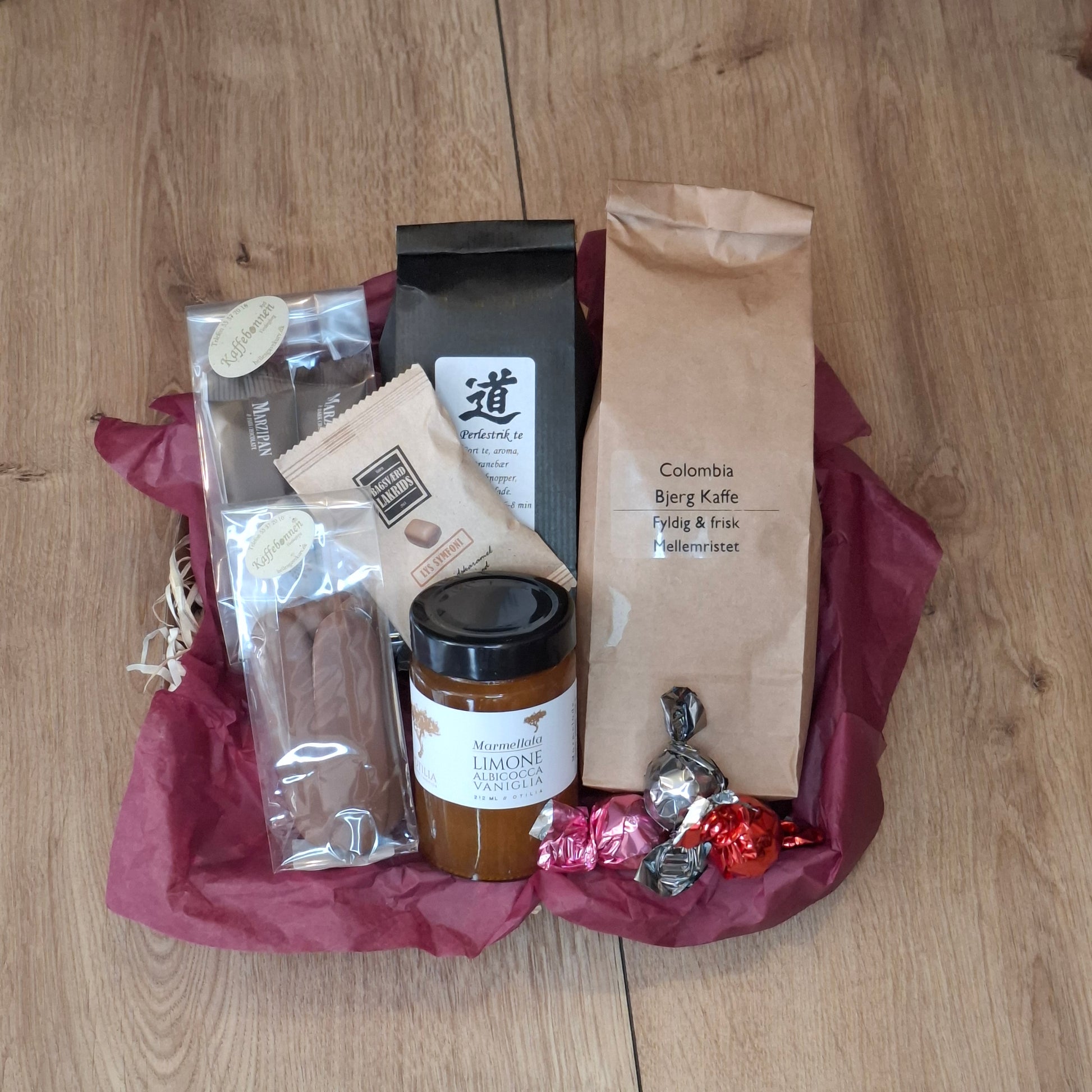 En lille luksuriøs gaveæske fyldt med nøje udvalgte aromatisk kaffe og smagfuld te. Skøn marmelade som passer til årstiden og forskellige delikat chokolader. En harmonisk blanding af søde fristelser og fyldige smagsoplevelser.