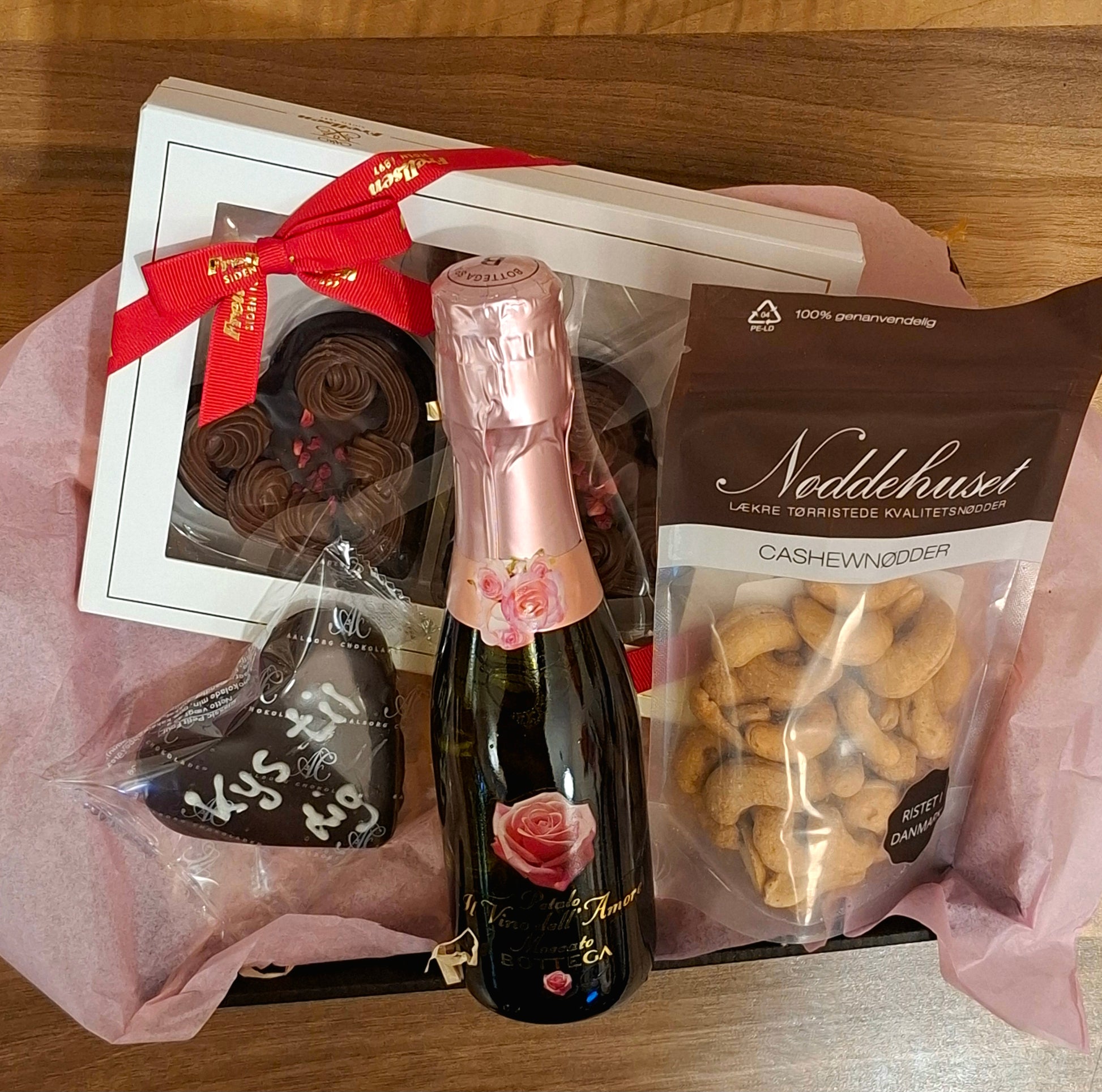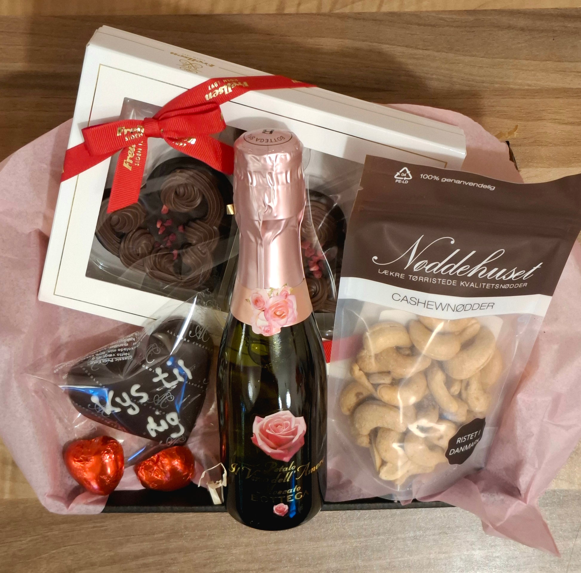 En smuk og stemningsfuld Valentin gaveæske, perfekt når du vil forkæle en, du holder af. Gaveæsken er elegant pakket og indeholder en lækker kombination af bobler, god chokolade og salte nødder – en skøn balance mellem sødt og salt, der passer til både hygge og fejring.