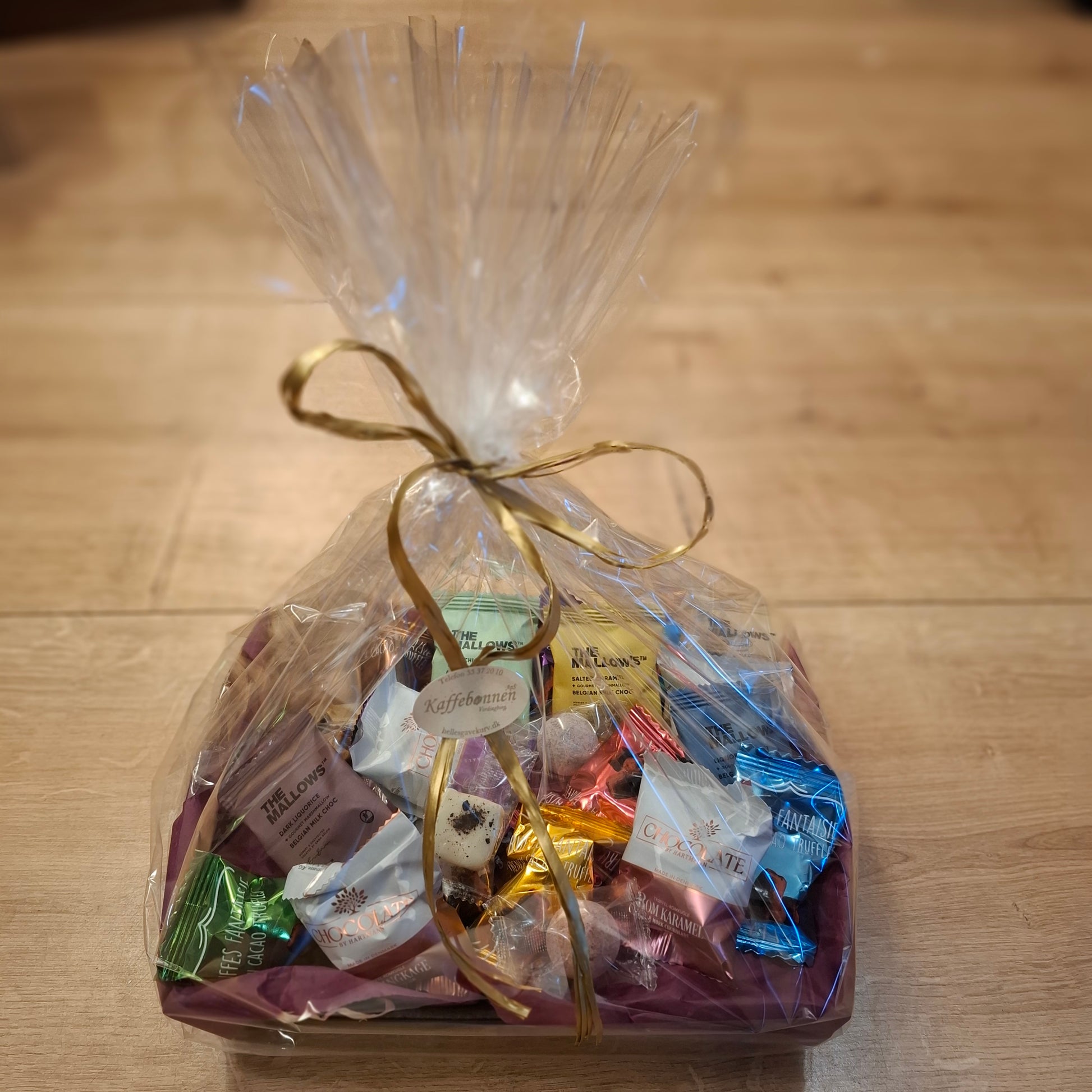 Indholdet varierer efter sæson og udvalg, men du kan forvente en skøn blanding af chokolade, bolcher, lakrids, vingummier, fyldte chokolader og andre søde specialiteter. Der er også mulighed for at vælge mellem kun indpakkede lækkerier, eller en blanding af både indpakkede og ikke-indpakkede lækkerier, så kurven passer præcis til behovet i jeres virksomhed eller hjem.