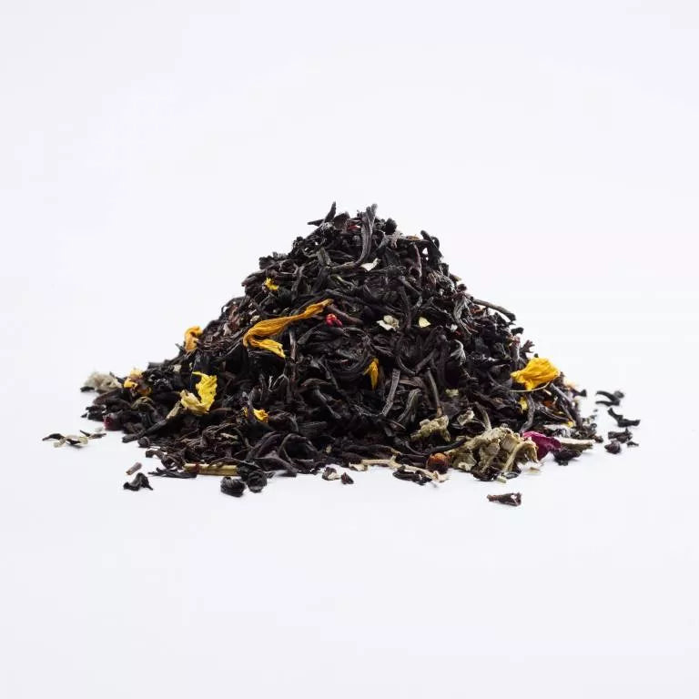 Ingredienser: Sort te, rosenblade, hyldebær, solbær, hindbær, hindbærblade, fersken.