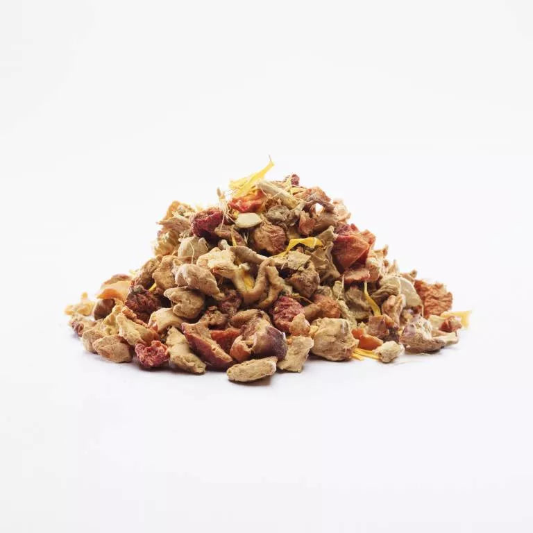 Ingredienser: Økologisk æblestykker, ingefær, mango, jordbær, morgenfrueblomster.