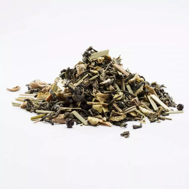 Ingredienser: Økologisk grøn te*, ingefær*, citronskal*, citrongræs*, citronsyre*, citrongræs-aroma*, ingefær-aroma*.
